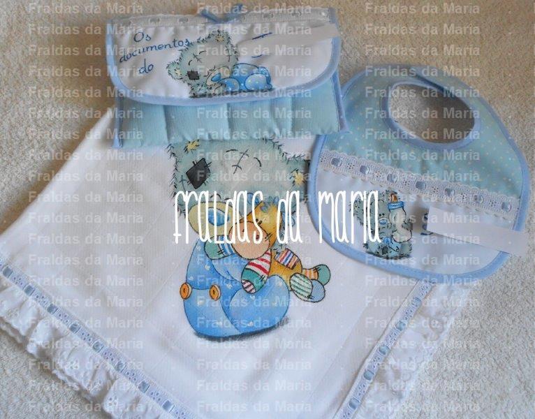 Conjunto Menino pintado à mão com o ursinho dos Forever Friends (Me to You). Composto por Porta-Documentos; Babete e Fralda.